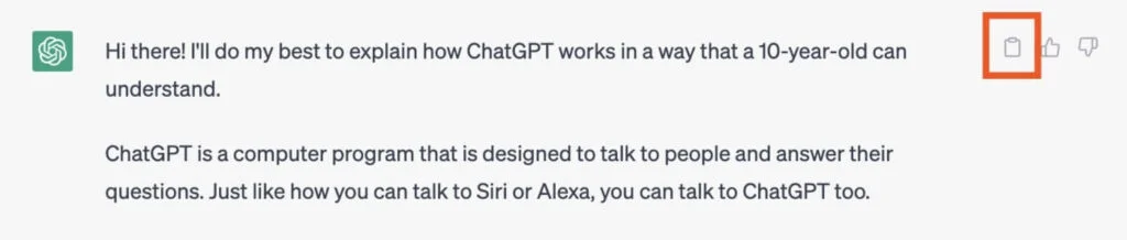 If you like ChatGPT’s answer and want to share it somewhere else, click the clipboard icon beside the response to copy it. Once you do this, the icon will turn into a checkmark to indicate that it’s been successfully copied. This button saves you from having to highlight the text and then using a keyboard shortcut to copy it.