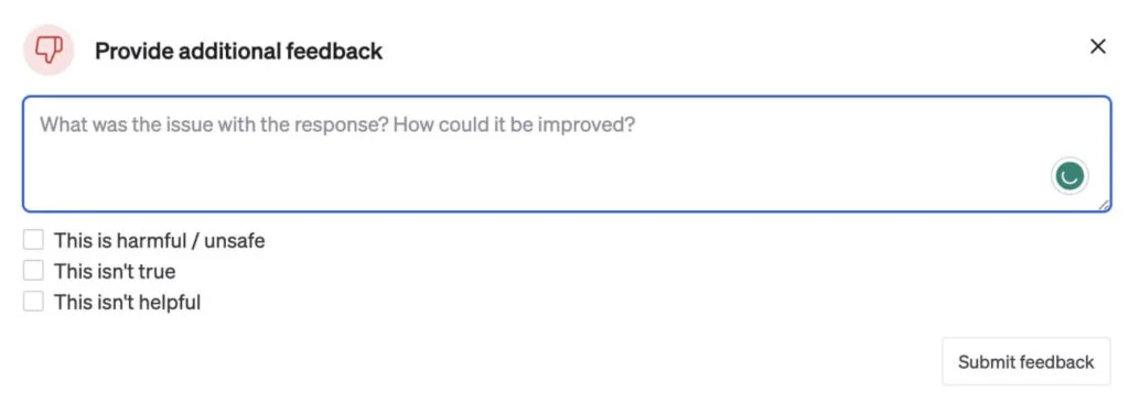 Alternatively, you can click the thumbs-down icon beside ChatGPT’s response to dislike it. Again, you’ll have the option to provide additional feedback by manually entering your response, or you can click any of the quick-select feedback options: This is harmful or unsafe; This isn’t true; and This isn’t helpful. (You can select more than one option.)