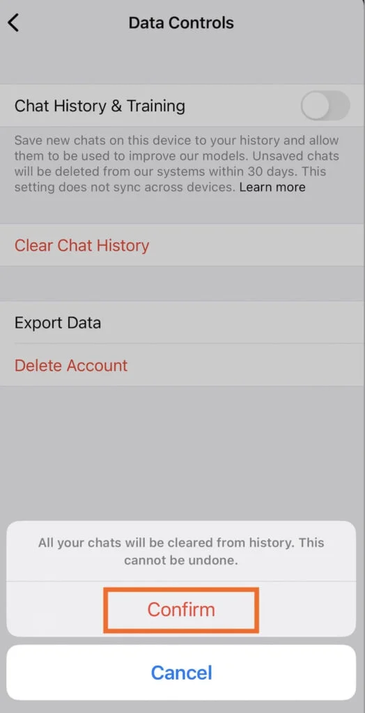 - Tap the toggle beside Chat History & Training. (To save new chats, tap the toggle again.)